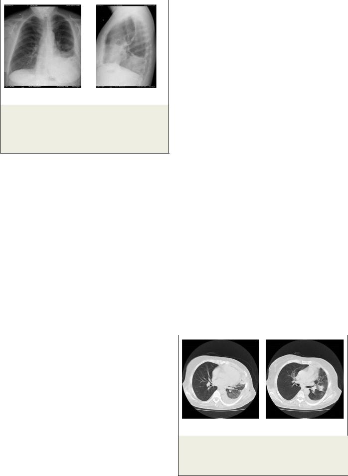 Больная П., 49 лет. Верхнедолевая деструктивная пневмония в S4, S5 слева. На планарных томосцинтиграммах, выполненных в раннюю (а) и отсроченную (б) фазы исследования, в проекции язычковых сегментов левого легкого определяется участок патологической гиперфиксации РФП с нечеткими контурами, неоднородной структуры, неправильной формы. В динамике интенсивность гиперфиксации индикатора в данном участке и четкость его контуров существенно уменьшились.