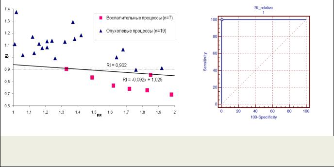 исследования (p=0,65), чаще имели однородную структуру (p=0,63) и правильную геометрическую форму (p=0,27). При этом различие по данным признакам не достигало степени статистической значимости ни в одном случае (p>0,05). Однако снижение интенсивности гиперфиксации РФП и уменьшение четкости контуров участка повышенного накопления индикатора в отсроченную фазу исследования по сравнению с ранней наблюдались статистически значимо чаще при воспалительных процессах относительно новообразований (p<0,001 и p<0,001 соответственно). Проведенный ROCанализ выявил, что отсутствие выраженного снижения интенсивности гиперфиксации РФП
