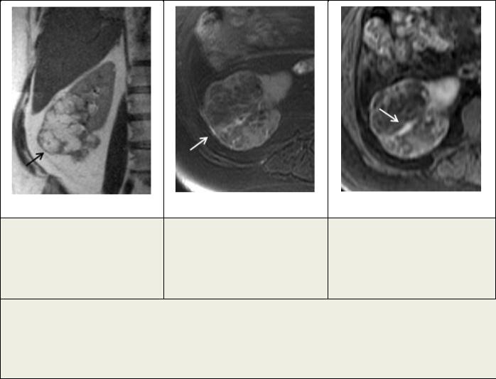 Ангиомиолипома почки с малигнизацией. В нижнем и среднем сегментах правой почки определяется крупное многоузловое образование неоднородной структуры, с наличием выраженного жирового компонента (А, Б, стрелки) и солидного компонента в виде «прослоек», интенсивно накапливающего контрастное вещество (В, стрелка).