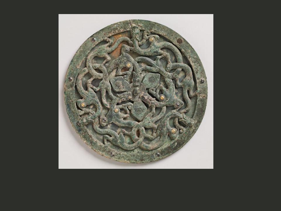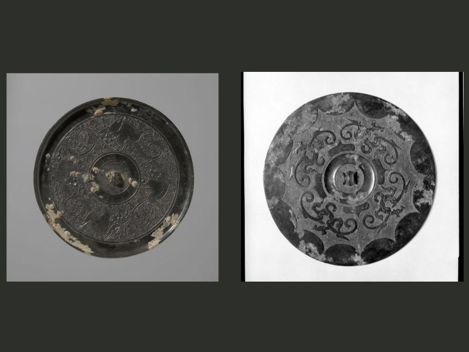 Зеркало с рельефом в виде шести драконов. Бронза, , серебряные бусины, позолота. Д 22.6 см. вес 1077 г