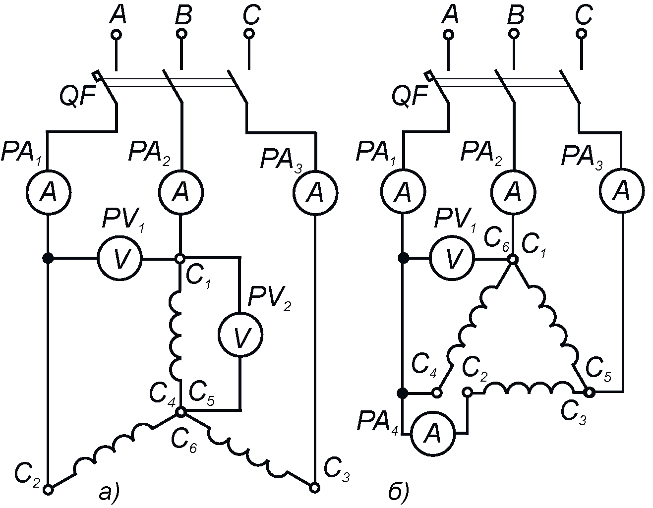Рис. 8 - Схеми з'єднань обмоток статора при дослідженні параметрів двигуна: а) - з'єднання "зіркою", б) - з'єднання "трикутником"