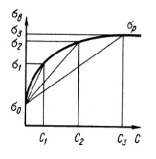 Видно, что, чем меньше предельная растворимость легирующей добавки, тем интенсивнее она влияет на прочность, т.к. в области малых концентраций кривая круто поднимается, но тем меньше ее эффективность на пределе растворимости (т.е. малый вклад).