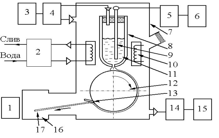 1 – пульт; 2 – генератор; 3 – баллон с газом; 4 – система напуска газа; 5 – прибор Р111; 6 – потенциометр КСП-4; 7 – корпус; 8 – питатель; 9 – термопара; 10 – индуктор; 11 – расплав; 12 – медный диск; 13 – лентосъемник;
