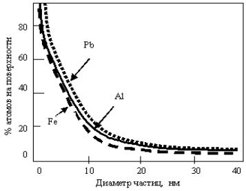 На рис. представлен график зависимости доли атомов на поверхности частицы от ее диаметра для частиц Fe, Pb и Al.