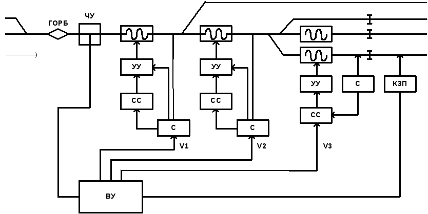 Фактическая и заданная скорость поступает на СС. Факт. скорость опр. Скоростемера СК. В случае, если Vф>Vзад1, на выходе СС возникает сигнал, который воздействует на УС, а УС управляет пневмоприводном механического замедлителя. Тормозные шины прижимаются к колесным парам и происходит торможение до тех пор, пока Vф не станет равной Vзад. Тогда на выходе СС сигнал пропадает и торможение прекращается.