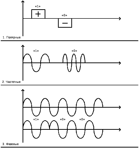 Если фазы противоположны, то передаем «0». Фазовые признаки обеспечивают самый помехозащищенный способ передачи.