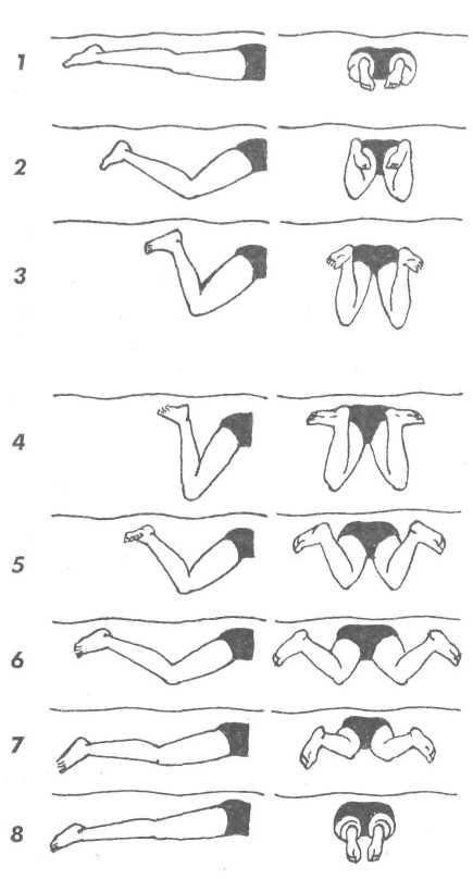 Подтягивание (см. поз. 1—3 на рис. 17) — подготовительное движение; оно начинается с плавного сгибания ног в коленях. При этом бедра сохраняют обтекаемое положение и не опускаются вниз; расслабленные стопы движутся у самой поверхности воды; колени расходятся в стороны примерно на ширину таза. В заключительный момент подтягивания (см. поз. 3 на рис. 17) бедра, голени и стопы быстро возвращаются в исходное положение для начала отталкивания: колени разводятся несколько шире таза, стопы
