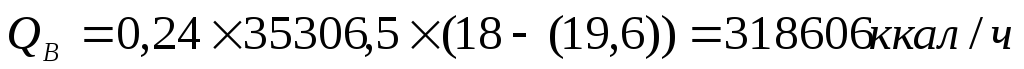 Часовой объем вентиляции в зимний период составляет 29300 м3/ч. Объемные величины переводим в весовые. 1м3воздуха при температуре 18ºС и барометрическом давлении 755 мм рт. имеет объемную массу в 1,205 кг. Отсюда, масса 29300 м3воздуха равна 35306,5 кг. Тогда
