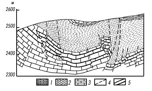 1 – слоистые известняки; 2 – черные известняковистые сланцы; 3 – массивные и грубослоистые известняки формации Санта-Эмилия; 4 – сбросы; 5 – пластообразные рудные залежи (манто)
