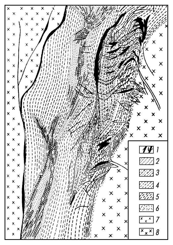 1 – лавовые покровы основного состава; 2 – переходный слой с конгломератами; 3 – лавовые покровы кислого состава; 4 – туфы кислого состава; 5 – граувакко-сланцевые породы; 6 – массивная колчеданная руда; 7 – рудный штокверк; 8 – пострудный сброс