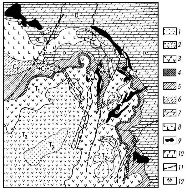1 – туфоалевролиты, 2 – песчаники, 3 – известняки, 4 – известковистые туфоалевролиты, 5 – субвулканические тела диорит-порфиритов, 6 – пермские (?) эффузивы среднего и основного состава; 7–8 – верхнекаменноугольные интрузивные породы: 7 – диориты, 8 – гранодиориты и кварцевые диориты; 9 – дайки диоритовых и диабазовых порфиритов, гранодиорит-порфиров, 10 – скарны, 11 – рудные тела, 12 – тектонические нарушения