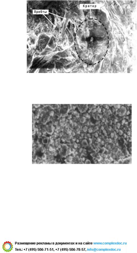 Рис. 12. Следы БПС на поверхности алюминиевого проводника (светлые области - хребты, темные области - кратеры). На снимке отмечен кратер, по краям которого расположены многочисленные хребты - результат длительного искрения (РЭМ, 600х)