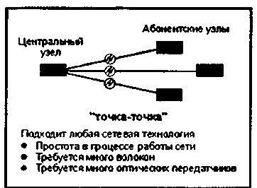 «Нүкте-нүкте» топологиялы қатынау желілерінде пайда болатын басты 25 қиындық – ол кабельдік жүйелерінің төмен тиімділігі, бұл олардың ғимарат қабатынан шығуына байланысты. Мұндай сәулетте орталық кеңседен әр ғимаратқа резервтелу мүмкіндігінсіз бөлек талшық жұбын енгізу қажет (немесе төрт резервтелу мүмкіндігімен). Бұл әдістеме тек мына жағдайда ақталады, егер абоненттік түйіндер (ғимараттағы абоненттер жиынтығы, кеңсе, мекеме) телекоммуникациялық қызметтер қолдану жағынан жеткілікті деңгейде рентабельді болып, олардың әрқайсысына жеке кабель тартылса.