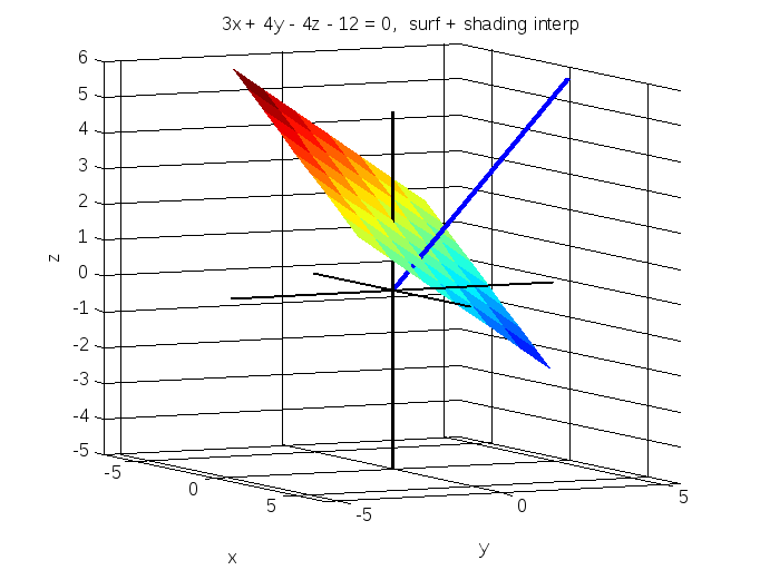 title('3x + 4y - 4z - 12 = 0, surf + shading interp')