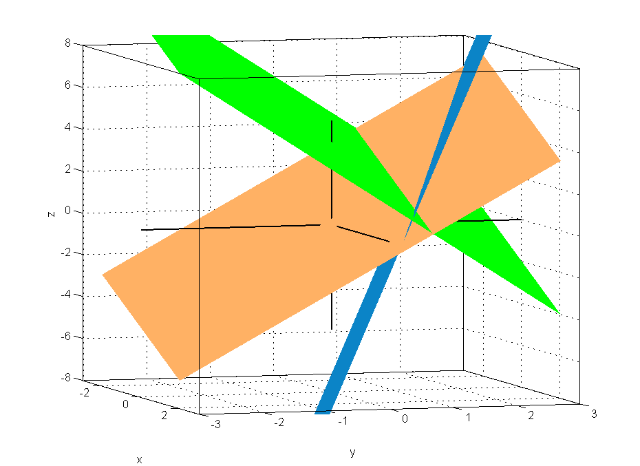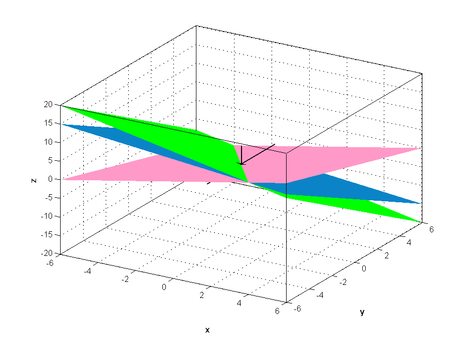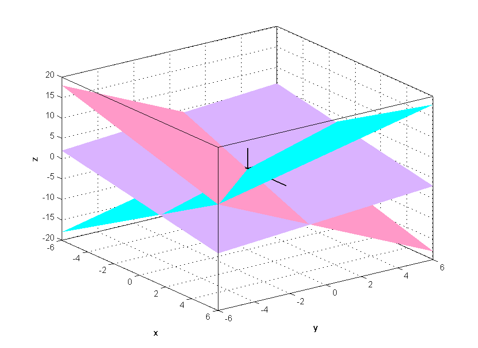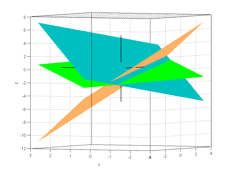 Задача.Создать М-функцию, осуществляющую построение трех плоскостей по уравнениям, взятыми из системы вида (12), с необходимым количеством аргументов и использовать ее для иллюстрации решений для нижеследующих систем: