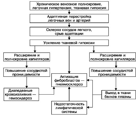предшествует ряд адаптивных процессов в сосудистом русле легких. В ответ на гипертензию в малом круге кровообращения происходит гипертрофия мышечно-эластических структур мелких ветвей легочной вены и артерии с перестройкой сосудов по типу замыкающих артерий, что предохраняет капилляры легкого от резкого переполнения кровью. Со временем адаптивные изменения сосудов легкого сменяются склеротическими, развиваются декомпенсация легочного кровообращения, переполнение капилляров межальвеолярных перегородок кровью. Нарастает гипоксия ткани, в связи с чем повышается сосудистая проницаемость, возникают множественные диапедезные кровоизлияния. В альвеолах, бронхах, межальвеолярных перегородках, лимфатических сосудах и узлах легких появляются скопления нагруженных гемосидерином клеток - сидеробластов и сидерофагов (см. рис. 55) и свободнолежащего гемосидерина. Возникает диффузный гемосидероз легких. Гемосидерин и белки плазмы (фибрин) «засоряют» строму и лимфатические дренажи легких, что ведет к резорбционной недостаточности их лимфатической системы, которая сменяется механической. Склероз кровеносных сосудов и недостаточность лимфатической системы усиливают легочную гипоксию, которая становится причиной пролиферации фибробластов, утолщения межальвеолярных перегородок (см. рис. 55). Возникает капиллярно-