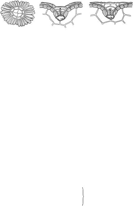 щения воды. В сухом состоянии радиальные стенки клеток волоска образуют складки, а «шляпка» прогибается в углубление кожицы. Когда мертвые клетки наполняются водой, поглощая ее капиллярным путем из воздуха, живые клетки «ножки» и далее эпидермы и паренхимы листа всасывают ее из них осмотически. При этом радиальные стенки выпрямляются, объем клеток увеличивается. Выравнивается и вогнутость «шляпки»: теперь она находится на уровне поверхности эпидермы (рис. 65).