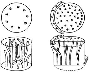 Далее в остаточной меристеме формируются прокамбиальные тяжи. Первые из них являются листовыми следами ближайших листовых зачатков (см. рис. 104). После формирования всех прокамбиальных пучков на данном уровне конуса нарастания участки остаточной меристемы между ними превращаются в межпучковую паренхиму. В узлах часть остаточной меристемы образует паренхиму листовых лакун. В кольце остаточной меристемы различных растений может образовываться разноеколичествопрокамбиальныхпучков:многомелких,небольшоечисло крупных или пучки могут соединяться в сплошное кольцо (рис. 109).