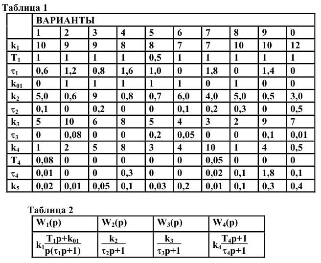 1 Определить передаточные функции звеньев системы автоматического регулирования (САР) по передаточным функциям, приведенным в таблице 2, путем исключения тех параметров, которые имеют нулевые значения в соответствующем столбце таблицы 1. Номер столбца таблицы 1 выбирается по предпоследней цифре (0÷9) номера зачетной книжки. Предварительно принятьWн(p)=1.