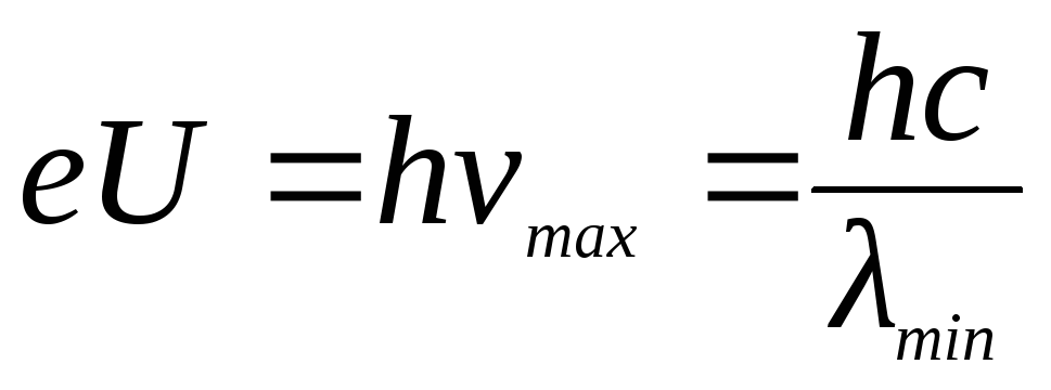 Рентгеновское излучение, возникающее при торможении потока электронов электростатическим полем атома называется тормозным, его спектр является непрерывным. В каждом из спектров наиболее коротковолновое тормозное излучение min возникает тогда, когда энергия, приобретенная электроном в ускоряющем поле, полностью переходит в энергию кванта: