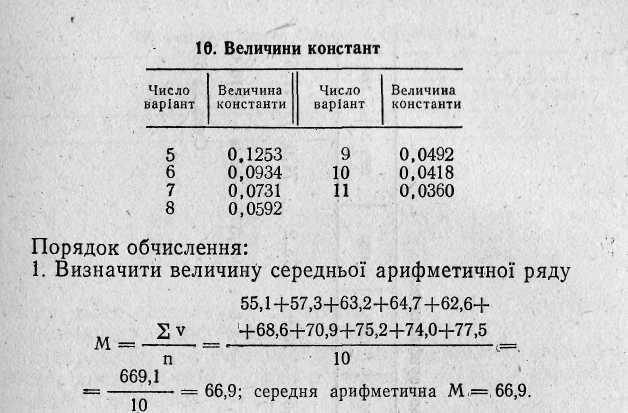 Наприклад, для середньої М=66,9, знайденої вище по 10 варіантах (n=10), і для помилки m=2,65, знаходимо t=66.9 : 2,65 = 25,2.