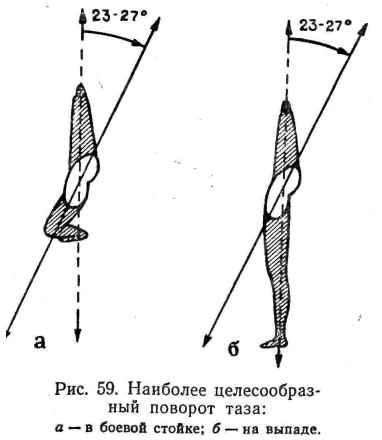 По исследованиям автора, проведенным на группе ведущих мастеров рапирного фехтования, вертикальный поворот таза и плеч по отношению к боевой плоскости в 90% случаев равен 23—27°, а в 10% случаев равен 15—22°. На этой основе наиболее целесообразным поворотом таза в типовой боевой стойке рапириста и на выпаде следует считать вертикальный угол поворота наружу по отношению к боевой плоскости, равный от 23 до 27° (рис. 59).