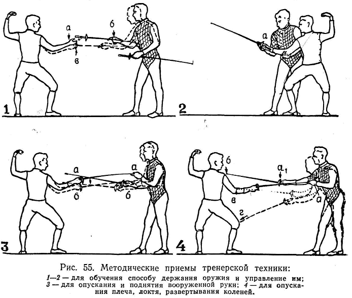 при необходимости заставить ученика опустить напряженное плечо, убрать локоть внутрь, развернуть ногу преподаватель действует клинком своей рапиры, дотрагиваясь оружием до определенной части тела ученика (рис. 55, 4).