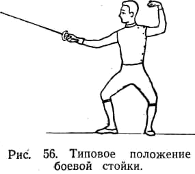 Боевая стойка и передвижения в ней. Боевая стойка рапириста — наиболее выгодное и целесообразное положение тела бойца во время боя (рис. 56). Положение боевой стойки позволяет изменять взаимное расположение звеньев тела, а также противодействовать колебаниям тела в различных плоскостях и обеспечивает оптимальные условия для сохранения равновесия всего тела при динамике действий.