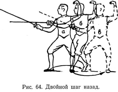Двойной шаг назад применяется для увеличения дистанции и отступления. Выполняется последовательными скрестными шагами назад правой и левой ногой. Правую ногу плавно проносят скрестно за левой и ставят сзади нее (носок обращен вперед). Левую ногу переставляют назад на такое же расстояние в положение боевой стойки (рис. 64).