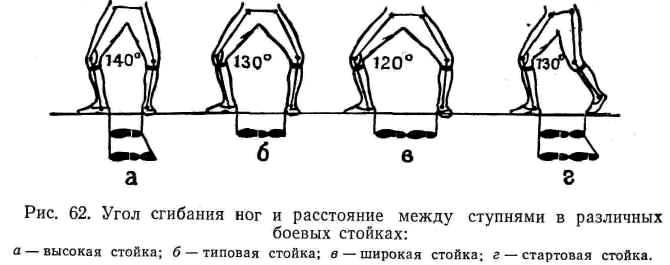 Ширина боевой стойки и степень сгибания ног колеблются и часто умышленно изменяются от узкого до широкого положения, в зависимости от характера боевых действий (рис. 62).