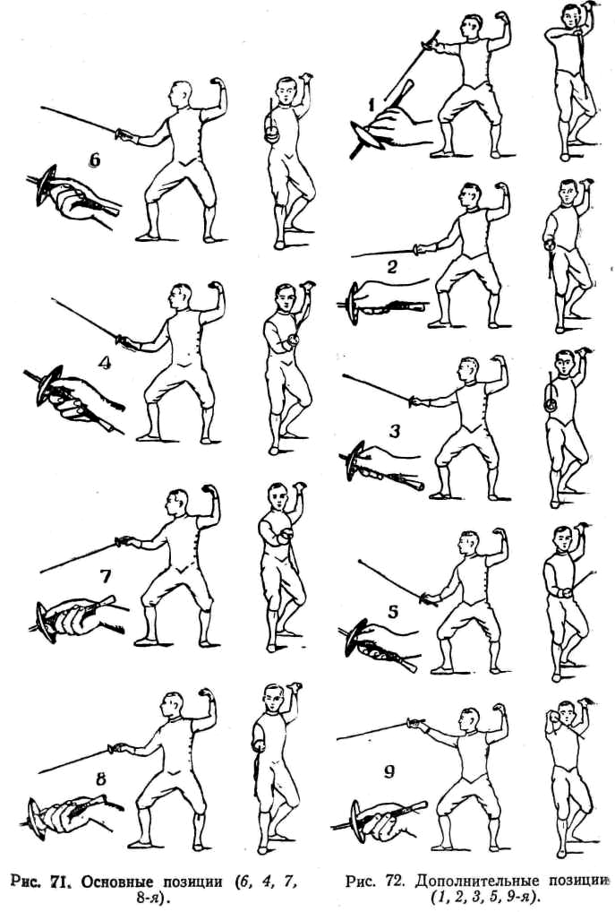 Позиции, их перемена и уклонения. Позиция — определенное целесообразное положение вооруженной руки и оружия по отношению к телу бойца. Позиции различаются по номерам — от 1-й до 9-й. Номер позиции определяется расположением вооруженной руки и оружия в той или другой фехтовальной линии.