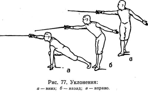 Уклонение назад выполняется передвиганием правой ноги назад к левой с отодвиганием таза назад, наклоном туловища вперед и вытягиванием вооруженной руки (рис. 77, б).