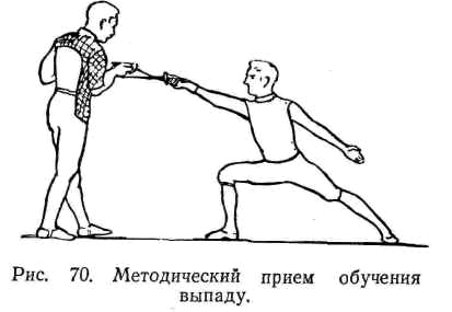 2. Держа клинок ученика левой рукой, преподаватель предлагает показать укол, по команде «Коли!» делает шаг правой ногой вправо, поддерживая клинок ученика своим оружием, поправляет его и оценивает исполнение (рис. 70).