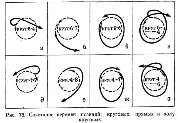 Сочетания перемены позиций круговых, прямых и полукруговых могут быть различные. Некоторые из них, наиболее типичные и применяемые в практике, показаны на рис. 76.