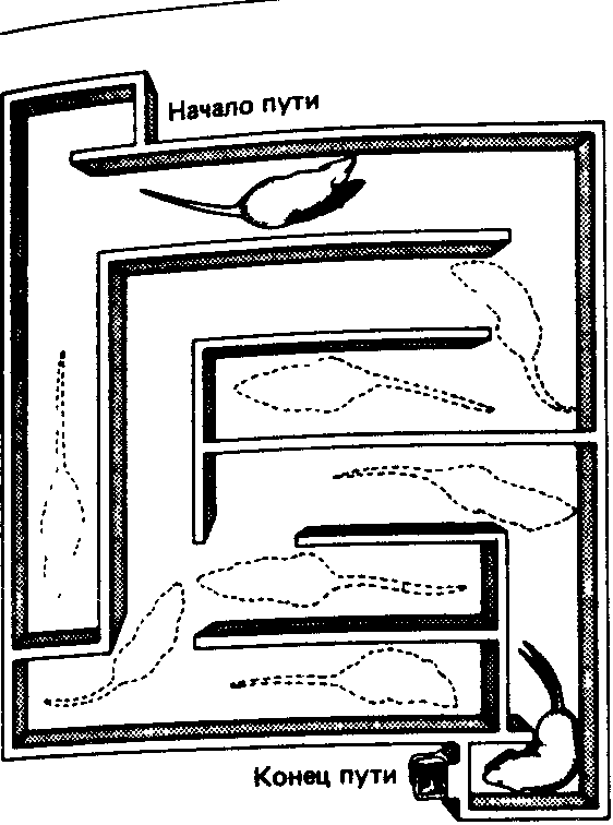 Рис. 3.10. Лабиринт с коридорами. На схеме показано, как крыса может проходить через лабиринт. Поколебавшись на развилках и обследовав тупики, животное доходит до того места, где находится пища, т. е. достигает цели (внизу справа). После ряда попыток крыса научается проходить через лабиринт без ошибок.