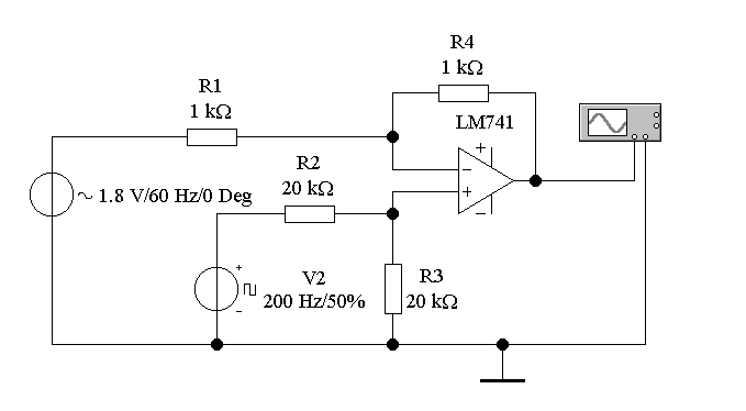 Зібрати схему підсилювача (рис 5.10), де Rн>2кОм, R1=R4=1кОм, R2=R3=20кОм. Впевнитись в тому, що схема віднімає вихідні напруги. В якості напруги UВХ1 можливо використовувати синусоїдальну напругу від генератора з параметрами UВХ1МАХ=1,8В, Т1=12,4мс, а в якості UВХ2 використовувати імпульси від генератора прямокутних імпульсів з параметрами UВХ2МАХ=0,6В, tU2700мс, dПОВТ=200Гц.