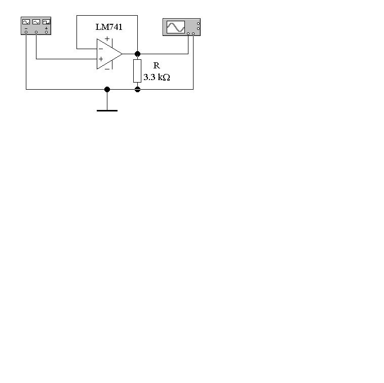 3. Зібрати схему неінвертувального повторювача напруги при R>2кОм (рис.5.9) та впевнитись у правильності її функціонування.