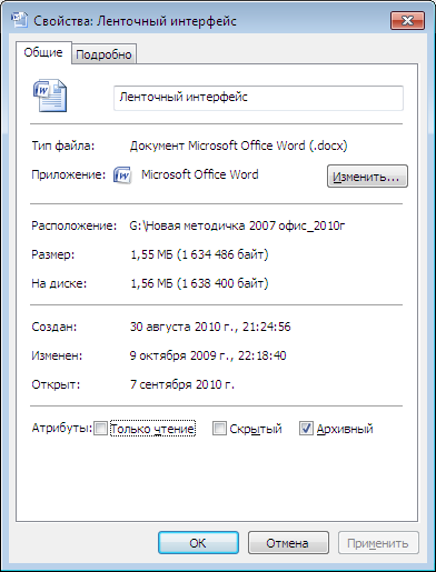 На странице Общие появившегося окна вы сможете увидеть, какие атрибуты установлены для файла, а какие сброшены. Любой файл в Windows характеризуется тремя атрибутами, назначение которых описано в таблице 1.