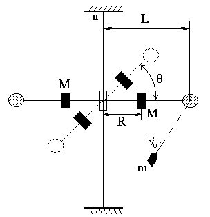 Пуля массы m попадает в мишень, укрепленную на стержне, который вместе с проволокой П образует крутильный маятник. Считая удар пули о мишень неупругим, для определения скорости V0 пули воспользуемся законом сохранения момента импульса в виде