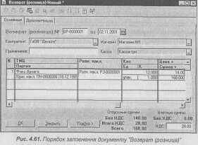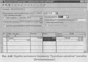 В реквізиті "Вид НДС" на закладці "Дополнительньїе" (рис. 4.48) має бути визначено ставку ПДВ для даної накладної. Відмітимо, що документ допускає оприбуткування запасів з різними ставками ПДВ (20 %, 0 %, без ПДВ) в одній накладній - для цього існує поле "НДС" в кожному рядку ™бличної частини.