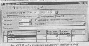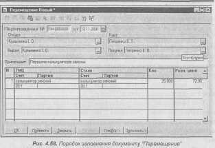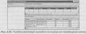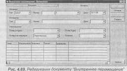 Для відображення операцій, пов'язаних з передачею запасів з одного підрозділу підприємства в інший (рис. 4.95), використовуються накладні на внутрішнє переміщення: "ХозОперации"- "Документи"- "Накладная на внутреннее перемещенниє"