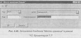 В режимі "1С: Бухгалтерия 7.7" для введення нових даних в довідник "Места хранепия" відкривається вікно, яке має наступний вигляд (рис. 4.46).