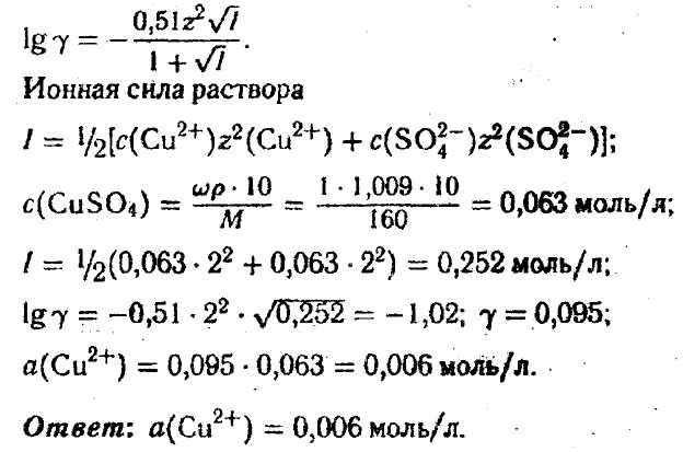 Задача 8. Водный раствор сульфата меди (П) с массовой долей 1% (ρ=1,009 г/мл) назначают в малых дозах для улучшения кроветворной функции. Вычислите активность ионов меди в таком растворе (Т = 298К).