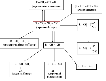 Схема взаимодействия между спиртами, галогеналканами, алканами и алкинами.
