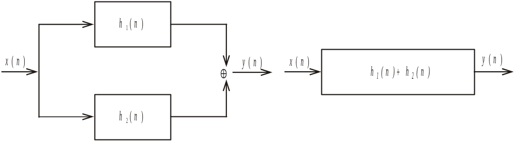 Из выражений для свёртки (1.23) и (1.25) следует также, что две линейные системы с постоянными параметрами включённые параллельно, эквивалентны одной линейной системе с импульсной характеристикой, равной сумме импульсных характеристик исходных систем (рис. 1.13).