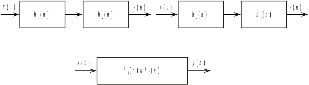Две линейные системы с постоянными параметрами, включённые последовательно (каскадно), образуют линейную систему с постоянными параметрами и импульсной характеристикой, равной свёртке импульсных характеристик исходных систем (рис. 1.11). При этом результирующая импульсная характеристика системы не зависит от порядка, в котором включены исходные системы.