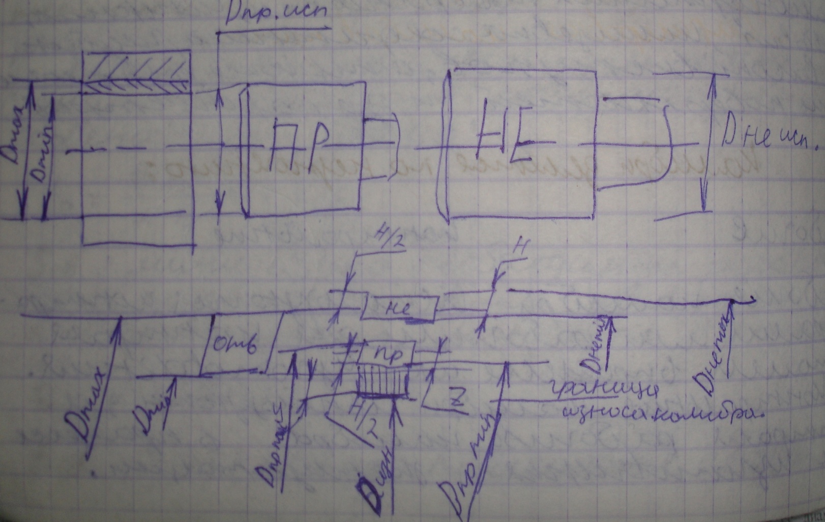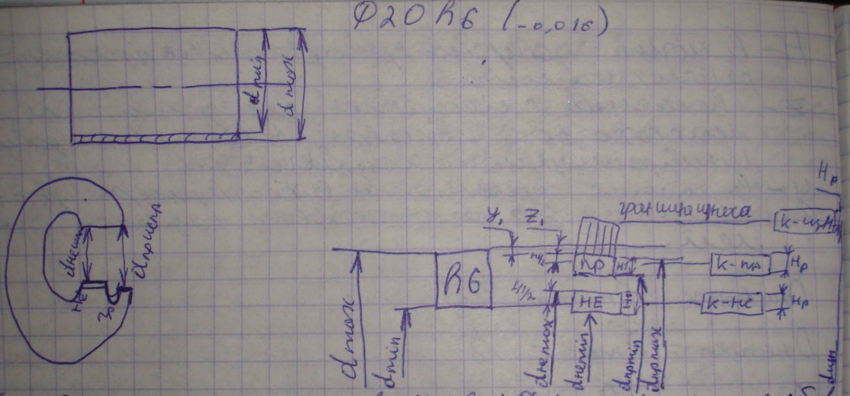 Н-велечина допуска проходного и не проходного рабочих калибров,z-велечина смещения середины поля допуска проходного калибра во внутреннем поле допуска контролируемого изделия,у-велечина определяющая выход размера изношенного калибра за предельные размеры деталией