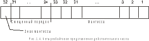 Существует несколько международных стандартов представления действительных чисел в памяти компьютера. Рассмотрим четырехбайтовый стандарт (рис. 1.4). Здесь зафиксированы три группы разрядов. Первый разряд хранит знак мантиссы. За ним следуют разряды, определяющие порядок. С первого по двадцать третий разряд располагается сама мантисса числа. Вместо истинного порядка хранится число, называемое характеристикой (или смещенным порядком). Характеристика равна порядку со смещением, причем смещение используется для более удобного хранения положительных и отрицательных действительных чисел.