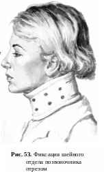 В случаях переломов дужек тел позвонков без смещения применяется иммобилизация шейного отдела воротником Шанца или специальным ортезом на 2-3 месяца (Рис.53). Мягкий воротник Шанца изготавливается следующим образом. В квадратный лоскут марли (80 Х 80 см) или хлопчатобумажной ткани помещают разрыхленную вату (400 г) так, чтобы по краям ее было меньше, чем в центре. Затем лоскут вместе с ватой сворачивают в косом направлении с любого угла, упаковывая вату, чтобы она не выступала по краям. Образовавшийся веретенообразный валик растягивают за два конца и обводят равномерно вокруг шеи. Ватно-марлевый воротник укрепляют несколькими турами бинта, создавая фиксацию шеи.