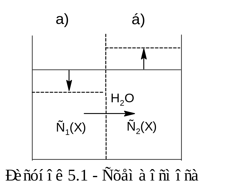 Разделим склянку на две части полупроницаемой перегородкой, например, целлофановой пленкой, способной пропускать молекулы растворителя, но не пропускающей частицы растворенного вещества (на рисунке 5.1 она показана пунктиром). В обе части нальем растворы с разной молярностью (один из растворов может быть и чистым растворителем).